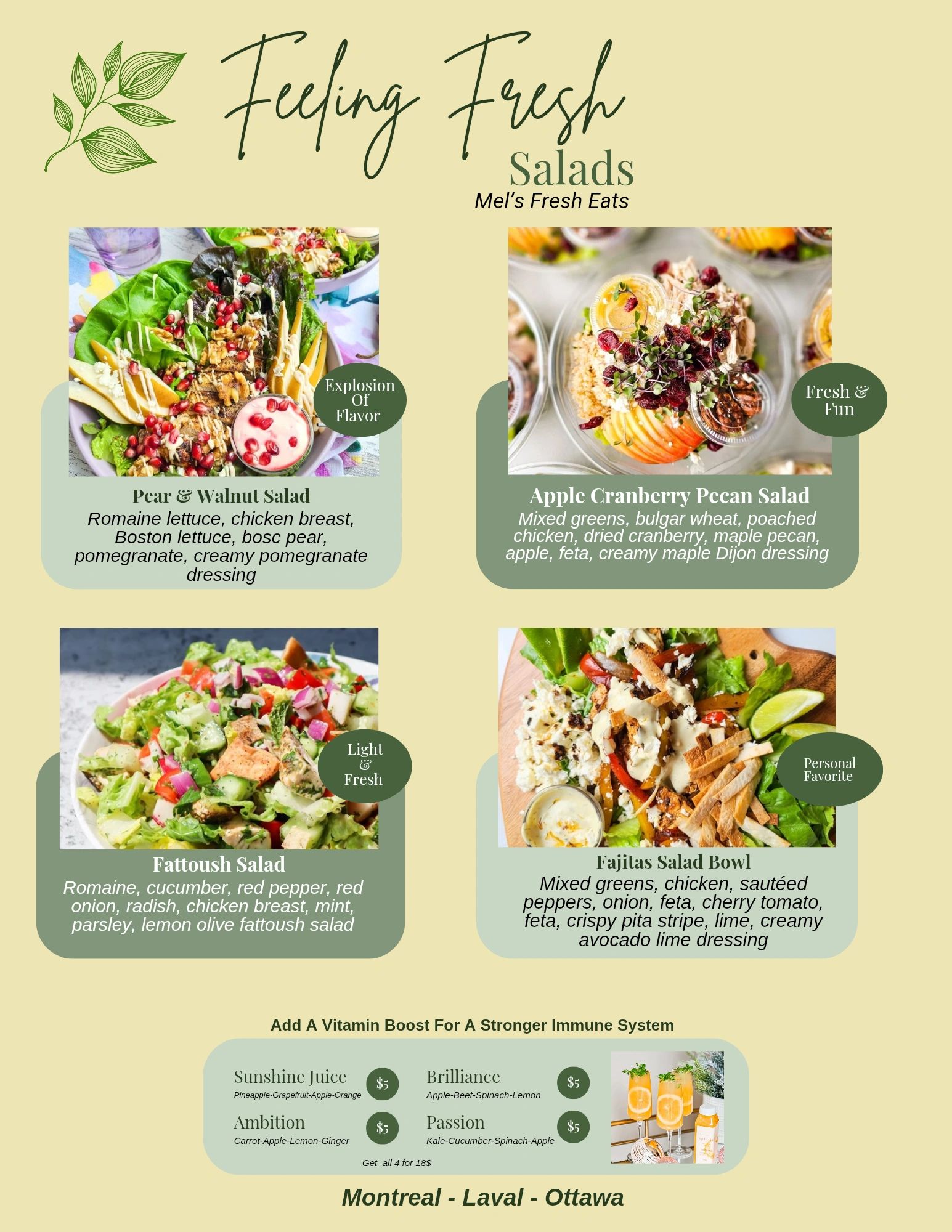 The menu offers 2 categories, 5 warm hugs and 5 feeling fresh salads.